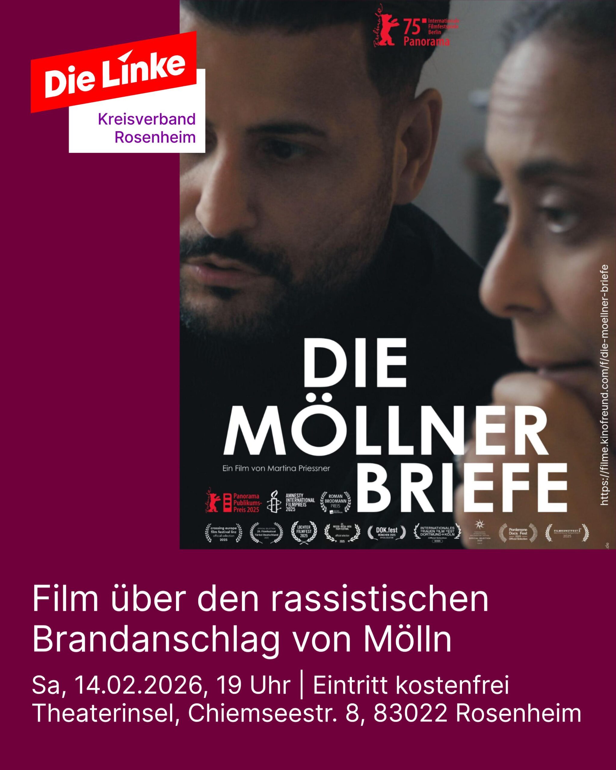 Am Samstag, den 14.02.2026, zeigt die Linke Rosenheim den Film „Die Möllner Briefe“. Die Veranstaltung beginnt um 19 Uhr in der Theaterinsel in der Chiemseestraße 8 in Rosenheim. Der Eintritt ist kostenlos.