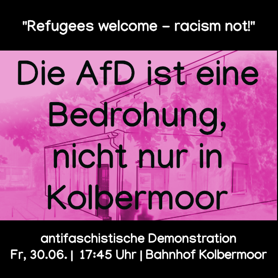 Die AfD mobilisiert für kommenden Freitag zu einer Hetzkundgebung gegen eine geplante Geflüchtetenunterkunft nach Kolbermoor. Diese extrem rechte Partei verbreitet wieder einmal nationalistische, völkische Hetze und organisiert soziale Unzufriedenheit rassistisch. Wir denken, die wirkliche Bedrohung geht von den Rassist*innen, und der Hetze, die sie verbreiten, aus. Wir treten ein gegen Nationalismus und für gemeinsame solidarische Organisierung. Aus diesem Grund unterstützen einige Gruppen aus dem linken Zentrum die Demonstration „Gemeinsam für Solidarität und Menschenrechte – Gegen die AfD Kundgebung in Kolbermoor!“